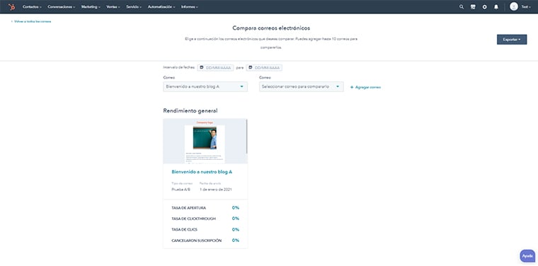 Además, en el caso de los correos electrónicos, si clicas en Comparar correos electrónicos puedes ver una tabla comparativa para ver qué email ha tenido un mejor rendimiento. Incluso puedes filtrar por intervalos de fecha, como ves aquí: