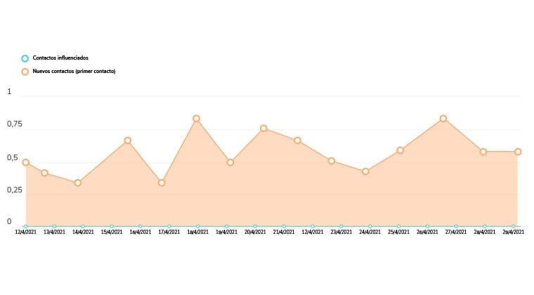 5) En el siguiente informe puedes ver un gráfico sobre los contactos o sesiones atribuidas a la campaña. Puedes elegir la frecuencia (diaria, mensual), puedes dividir entre contactos nuevos e influenciados clicando en la casilla Dividir por contactos nuevos e influenciados. Además, si clicas en Contactos puedes ver un informe también separado por Sesiones.