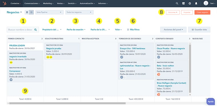 - Total precios: aquí puedes ver el valor total de todos los negocios inscritos en tu Pipeline de ventas.