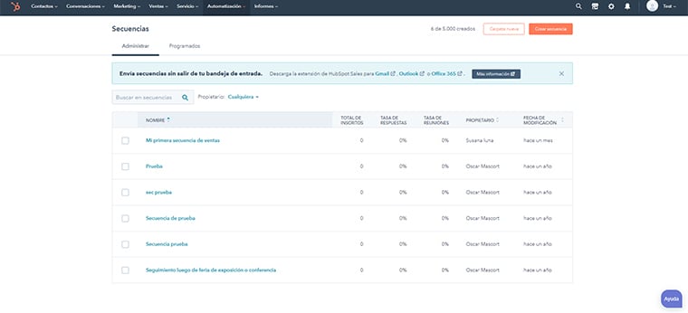 1. Entra en tu cuenta de HubSpot y clica en Automatización> Secuencias.