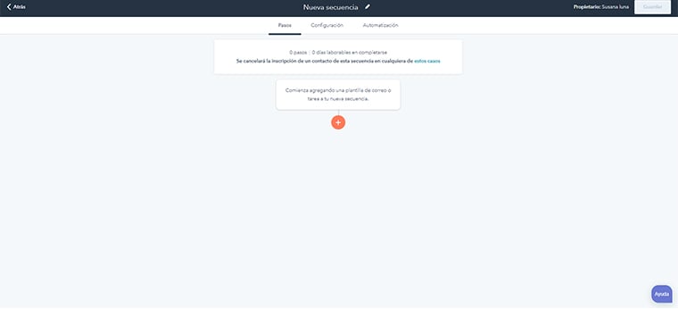 4. En la barra superior puedes clicar en el icono del lápiz y crear un nombre para tu secuencia. Justo debajo encontrarás otro menú con las opciones Pasos, Configuración y Automatización.