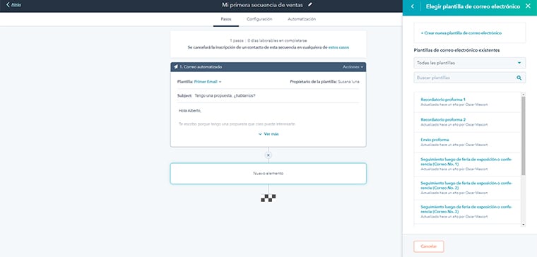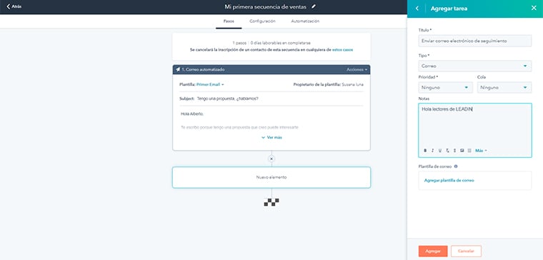 En HubSpot puedes crear secuencias que incluyan el lanzamiento de correos electrónicos de venta (enviados a través de tu Outlook, Gmail, etc.), crear tareas a realizar (por ejemplo, llamar al prospecto) y enviar mensajes Inmail en LinkedIn (este último si tienes licencia Sales Hub Professional o Sales Hub Enterprise).