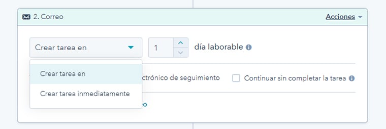 7. Si quieres establecer el número de días (o semanas) que deben pasar desde una tarea u otra, dentro de cada acción verás que hay un campo desplegable. Pues bien, desde aquí selecciona los días que desees que pasen hasta que se ejecute la tarea en cuestión.
