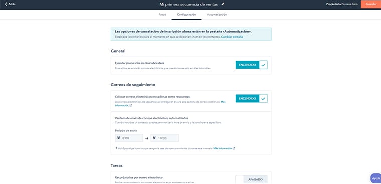 8. Volvamos al menú superior, concretamente a la pestaña Configuración. Desde aquí puedes configurar tu secuencia a tu gusto, incluidos los horarios de envío: