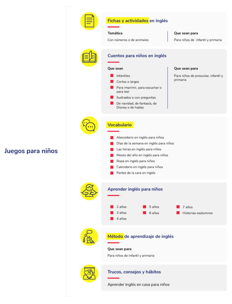Diseñamos estrategias de posicionamiento orgánico para colocar en buena posición todo el contenido digital que estábamos creando. Definimos que la temática y keyword principal era “inglés para niños”. A partir de aquí, creamos los subtemas dándoles forma a través de páginas pilar y subtemas.