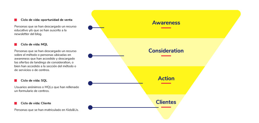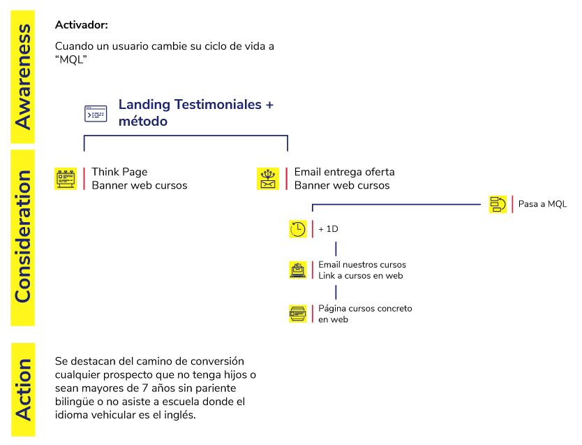 Descubrimos que el insight de compra era el miedo de los padres a que sus hijos en su etapa adulta no tuvieran un nivel alto de inglés, tal y como les había sucedido a ellos. Esta preocupación arrancaba en un funnel de compra que se iniciaba con el consumo de material audiovisual en inglés por Internet. Es ahí donde detectamos nuestra oportunidad Inbound.